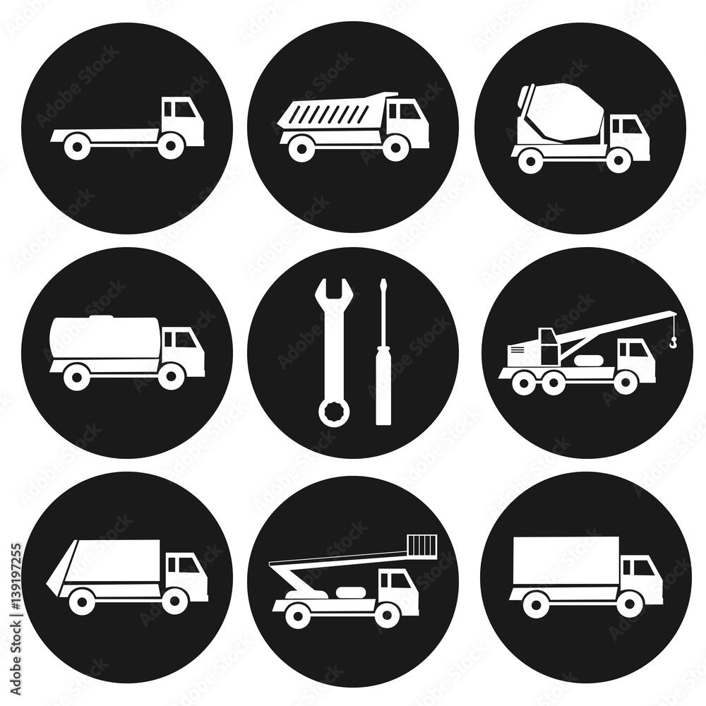 Set Of 9 Round Black Icons On Types Of Industrial Trucks Collection Of Construction Vehicles Stock Vector Adobe Stock